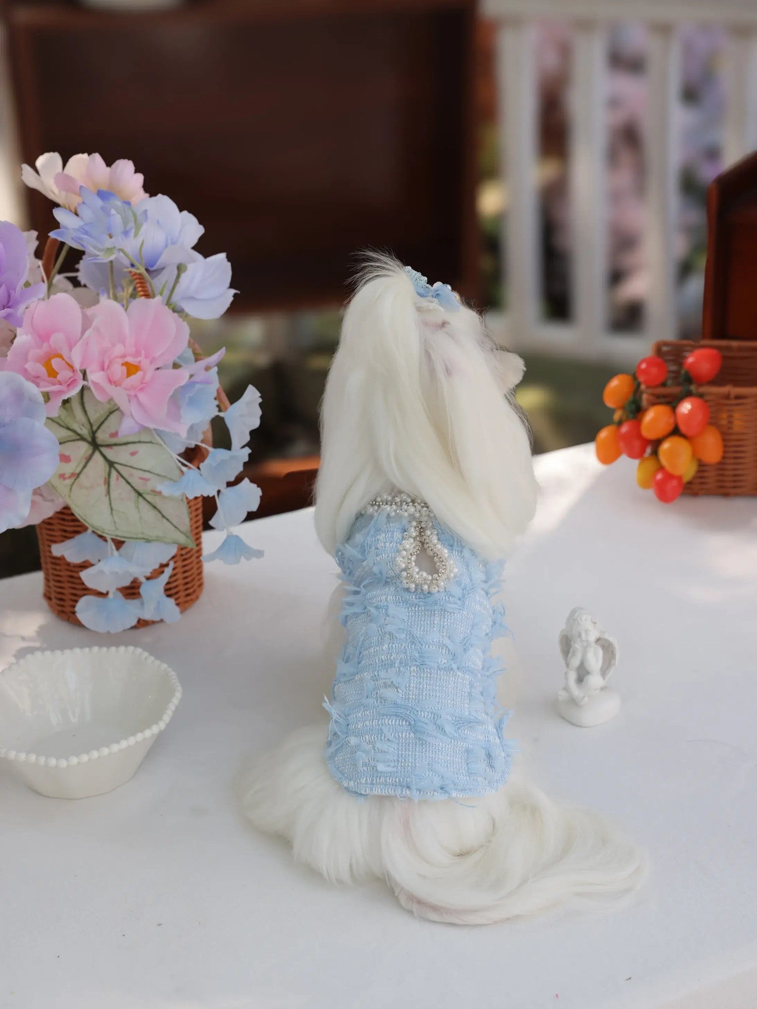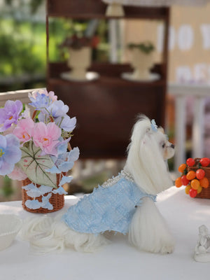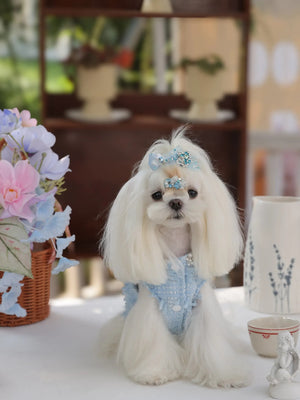 Under the gentle glow of the moonlight, your little darling glides gracefully in her misty blue jumpsuit, the soft polyester fabric catching every shimmer. Inspired by luxury princess fashion, this Lolita-style jumpsuit brings elegance and sophistication to small breeds like Shih Tzus, Pomeranians, and Toy Poodles. Perfect for evening strolls, garden parties, or special photoshoots, it transforms ordinary moments into enchanting memories worthy of a tiny royal.
